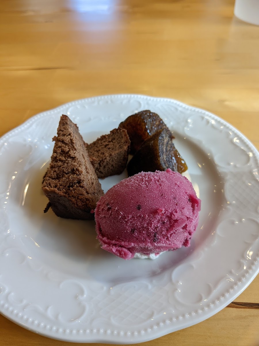 Lunch courses end on a memorable note with the ランチコースのデザート 渋柿の渋抜きとカシスアイス チョコケーキ. The combination of treated persimmon, cassis ice cream, and chocolate cake is thoughtful and layered, offering sweetness without excess. It feels crafted rather than decorative, which fits the overall philosophy of the restaurant.